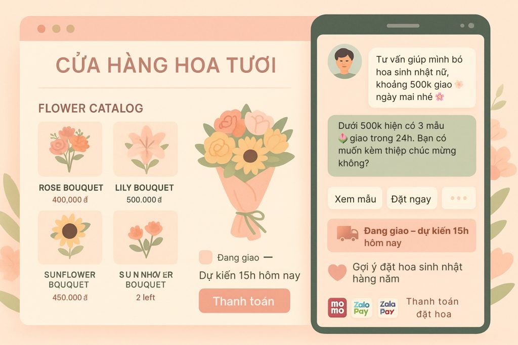 Thiết kế Website AI cho Cửa hàng hoa tươi là giải pháp chuyển đổi số bán lẻ, nâng website từ catalog tĩnh thành trợ lý bán hoa thông minh 24/7 (AI Sales Assistant).