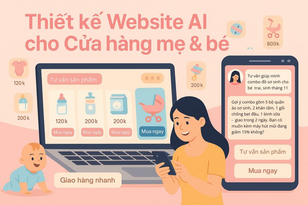 Thiết kế Website AI cho Cửa hàng mẹ & bé là giải pháp chuyển đổi số bán lẻ, biến website từ catalog tĩnh thành trợ lý bán hàng thông minh hoạt động 24/7.