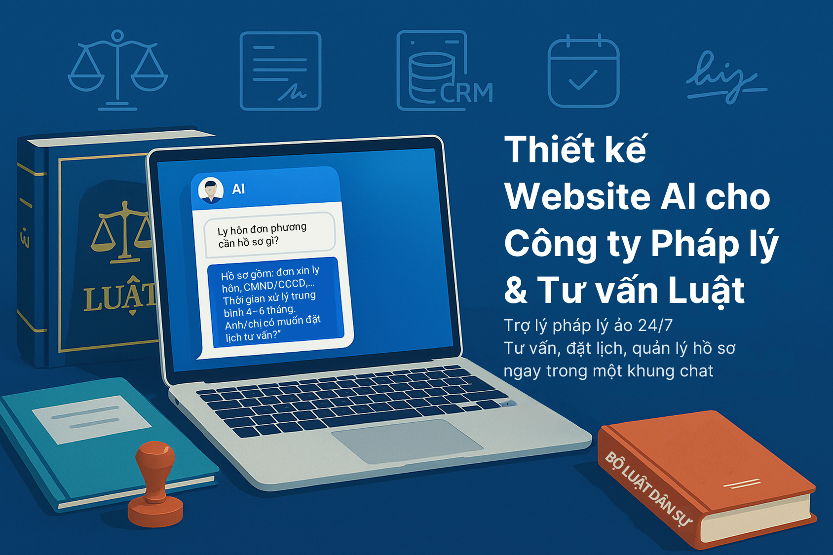 Kết nối CRM, lịch luật sư, báo giá dịch vụ. Khách có thể đặt lịch, xem phí tạm tính hoặc tải hợp đồng mẫu ngay trong khung chat.