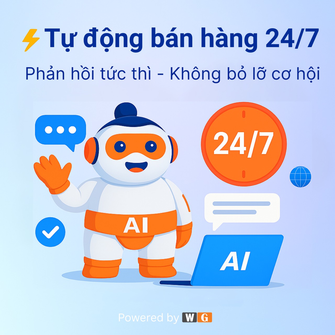 Liên hệAI Agent hỗ trợ trả lời khách hàng mọi lúc, mọi nơi, không bỏ sót bất kỳ cơ hội nào.”
